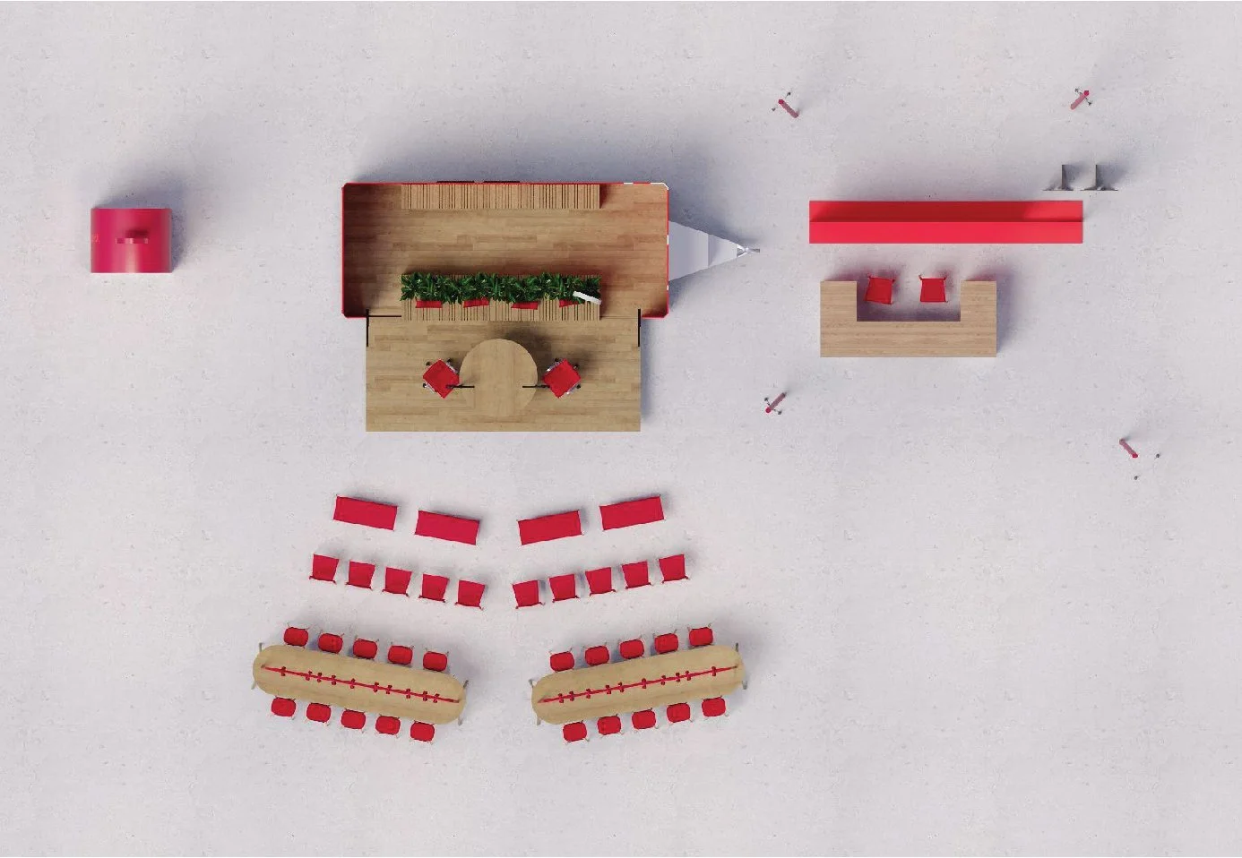 Open conversations deserve an open platform—which is why the new traveling studio opens up into a functional set piece. This design bridges the space between the speakers and the audience, with a communal atmosphere that elevates the studio presentation. The LG brand carries a strong presence across the stage interior and environmental elements. LG Active Red shines as the core color, communicating the brand identity across various elements within the space. Wood accents deliver on the brand value of bringing warmth to everything LG does. As a whole, the space feels vibrant, young and, clean.