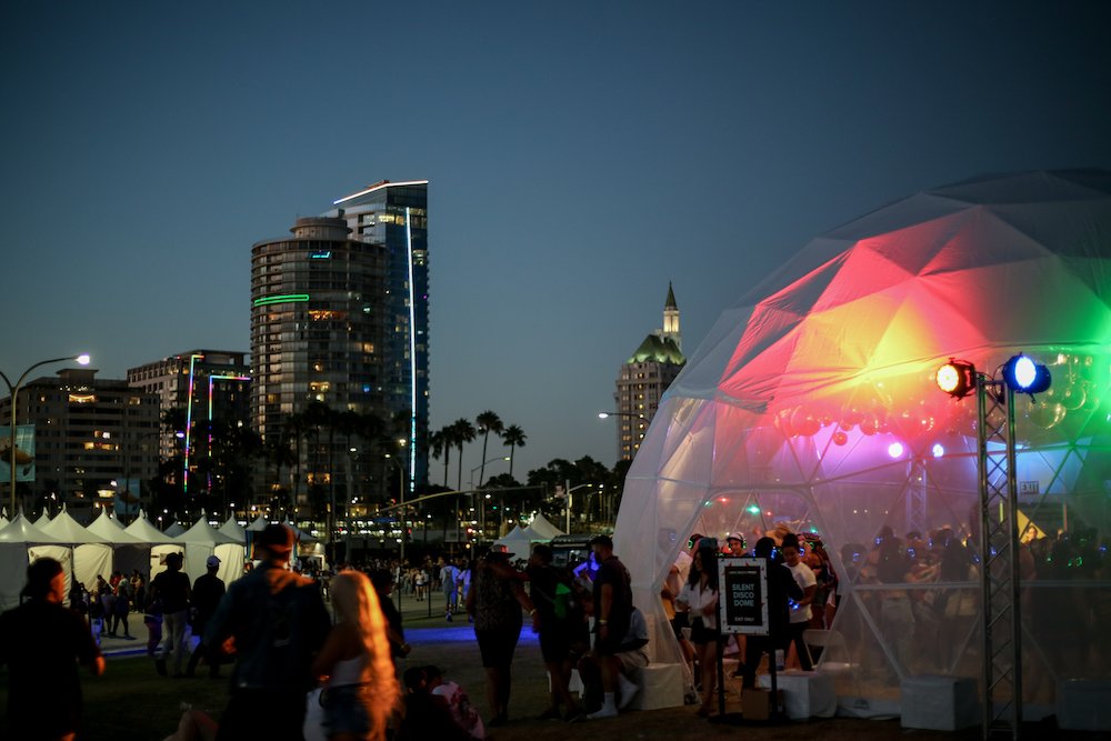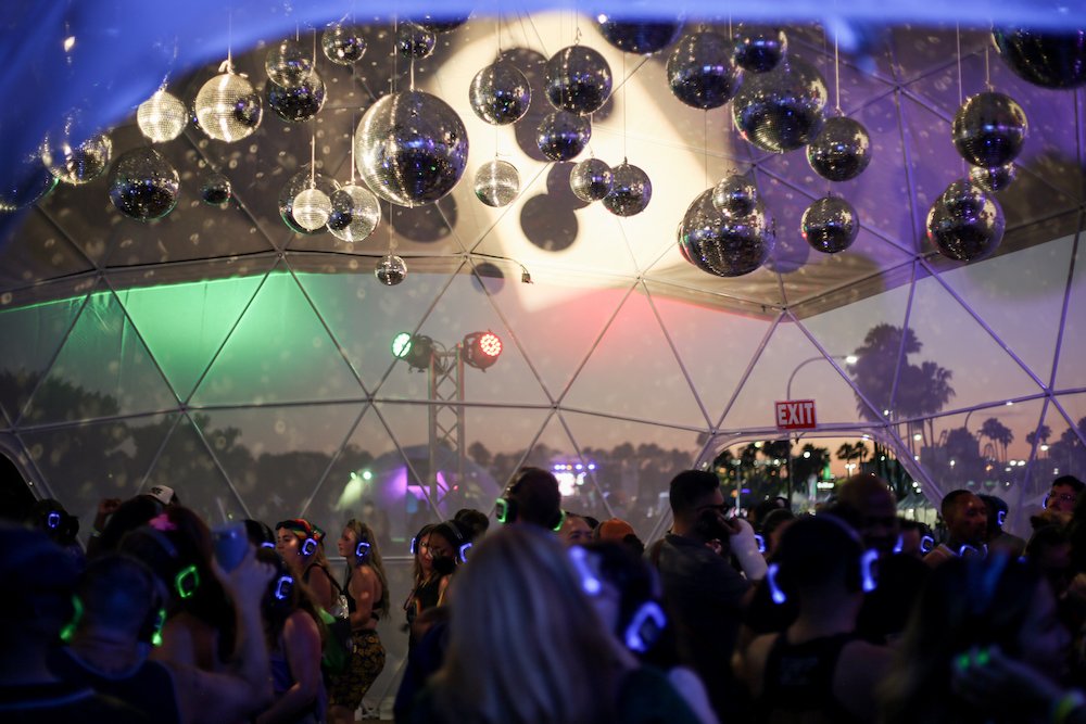 Festival revelers were encouraged to pop on special headphones and dance to their own beat all weekend long. The silent disco dome was a dynamic, glittering space decked out with a ceiling covered in disco balls and an iridescent mylar DJ booth.
