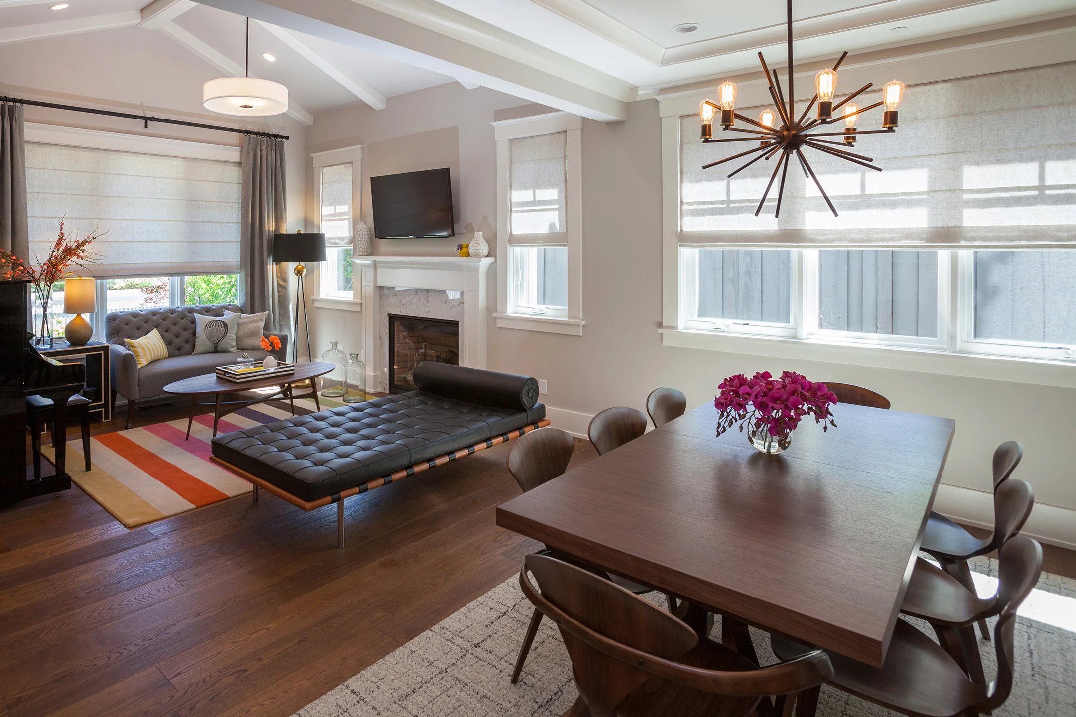 The family room has splashes of color and artwork with modern themes. The Barcelona sofa designed by Ludwig Mies van der Rohe, acts as a connection from the dining room to the family room. The family often entertains large groups so it was important to not cut the room in half. Form and function go hand in hand in this open space.