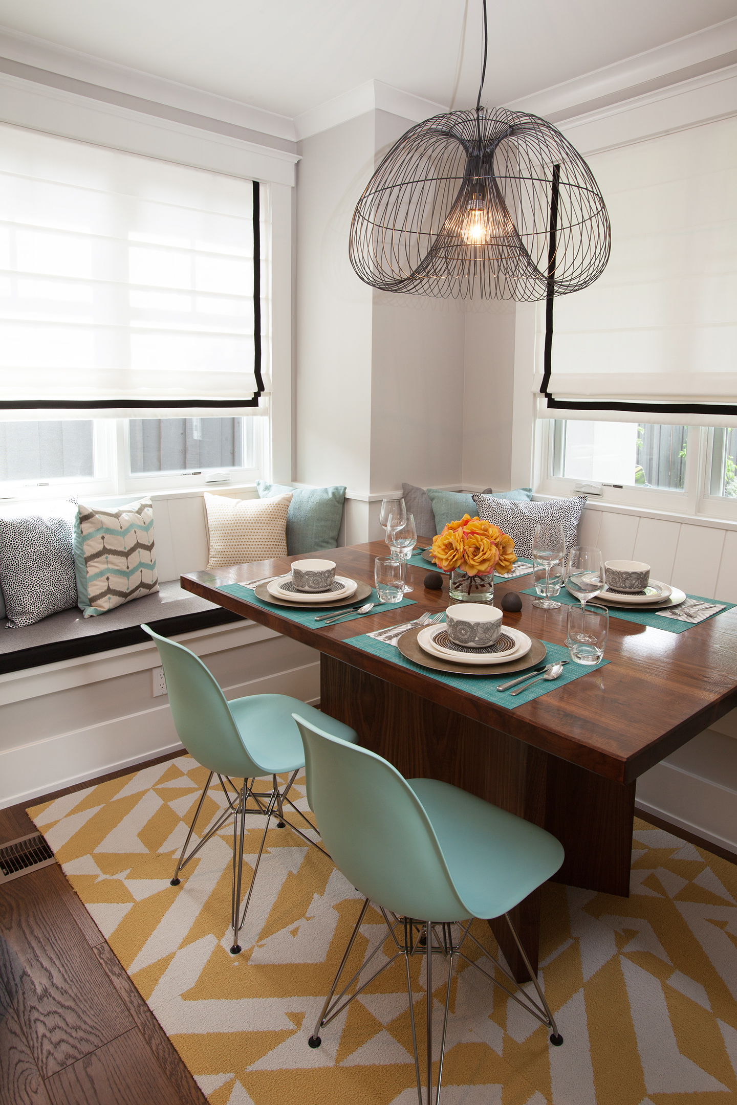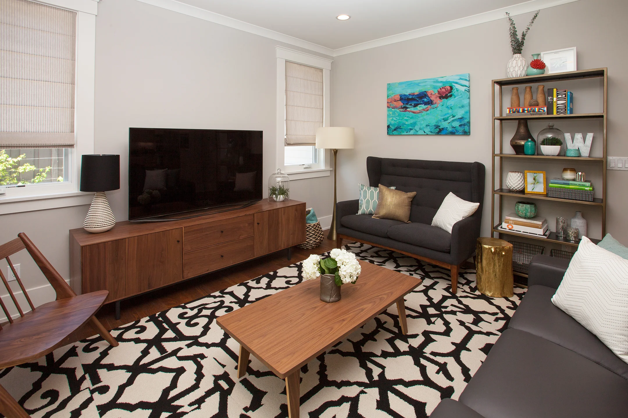 Large accordion windows from the living room open up to the outdoor patio and beautifully landscaped backyard. The seating is ample with a highlight of two modern low black chairs made of durable plastic woven across a powder coated frame. A bold black and white chevron area rug connects back to the interior.