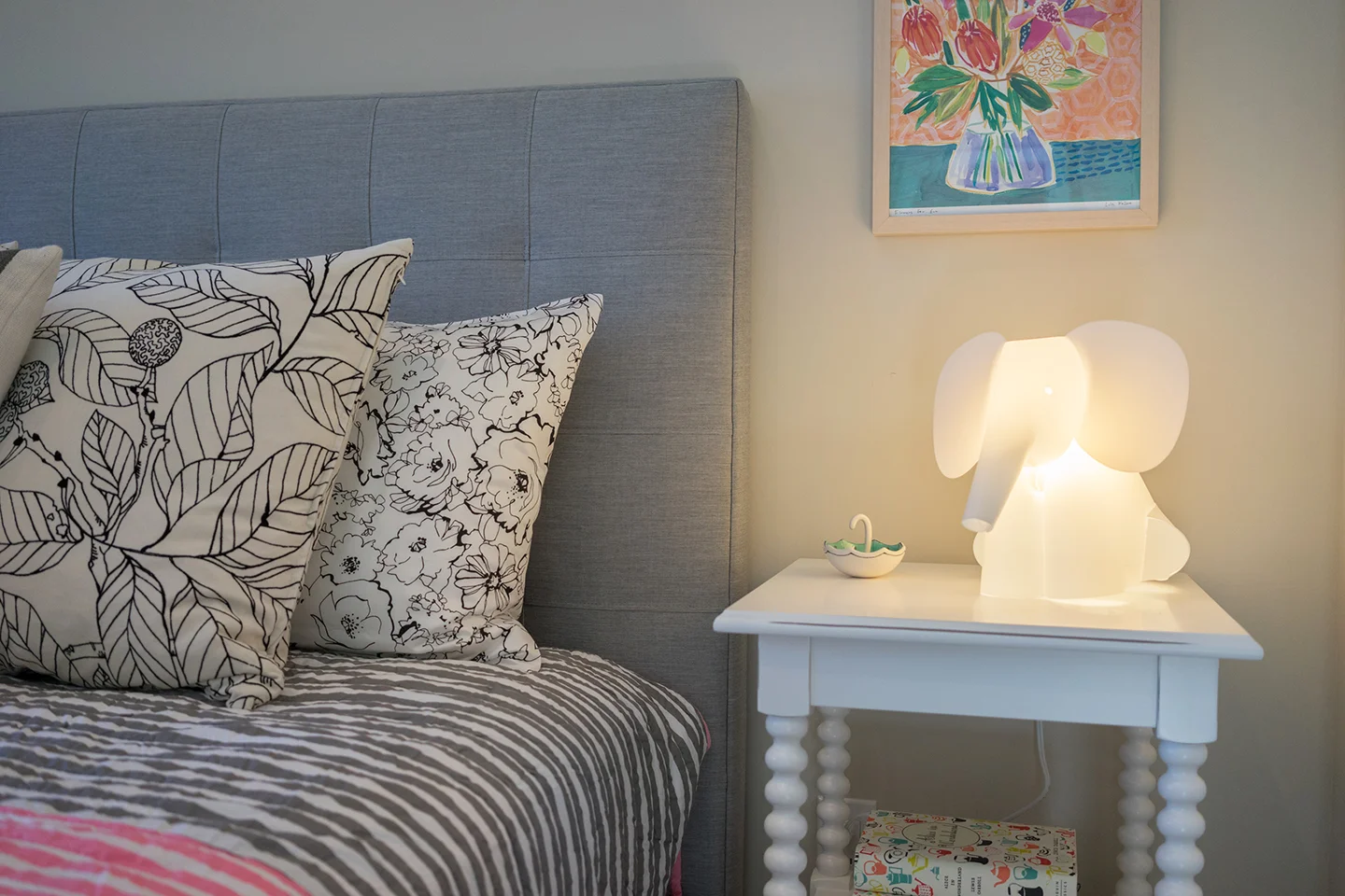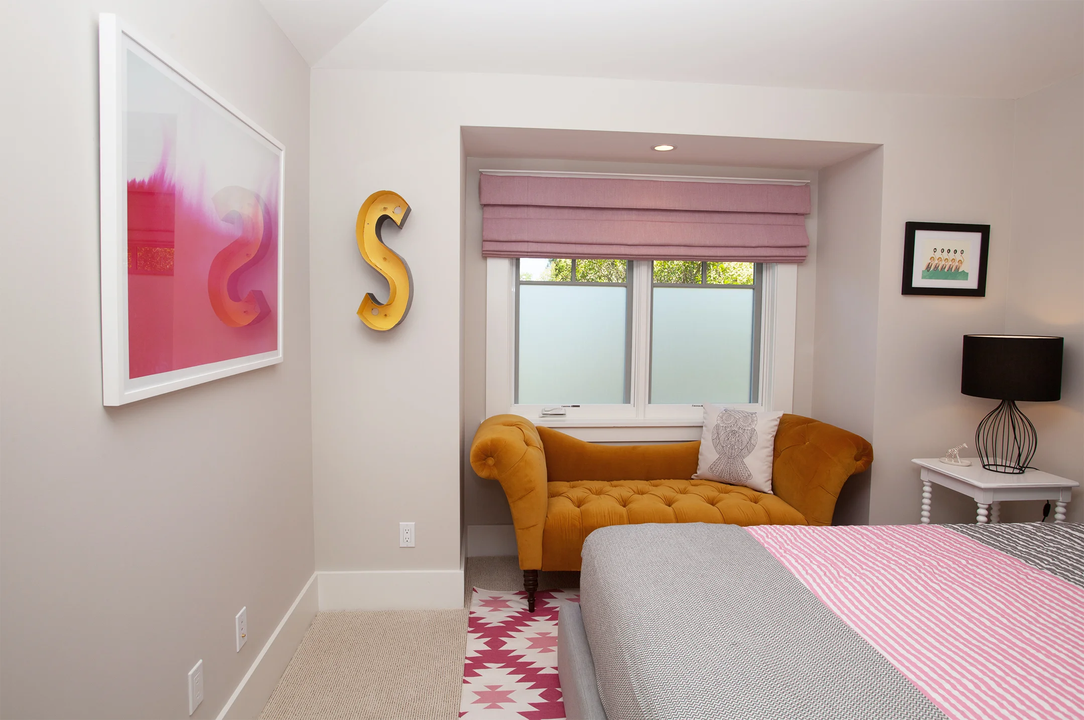 The 9-year-old girl gets a mature space, sprinkled in soft pinks and mustards. The bed frame has a large drawer at the base which allows for more storage and places to tuck things away. A found letter ‘S’ from an antique shop and custom window treatments complete the space making it a cozy and feminine yet grown-up room in which to relax and play.